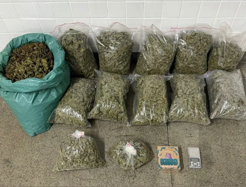 Entre os itens encontrados estavam 34 quilos de maconha, uma balança de precisão e uma caixa de papel de seda.