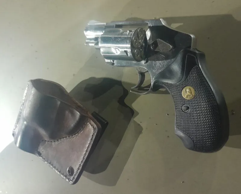 Após diligências, o suspeito foi localizado em um estabelecimento comercial. Durante a abordagem e busca pessoal, foi encontrado em sua posse um revólver calibre .38 com cinco munições.