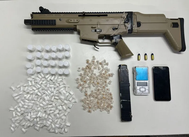 Uma varredura foi feita no local, quando foram encontrados, dentro de uma mochila, uma metralhadora calibre 9mm com quatro munições, 218 recipientes de cocaína, 130 frascos de pedras de crack, uma balança de precisão e um celular.