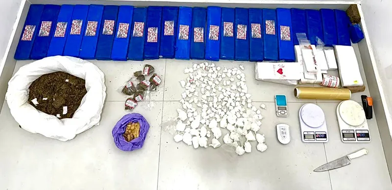 Buscas foram realizadas no local onde ele estava, sendo encontrados 24 tabletes de maconha, uma sacola com a erva, 178 porções de cocaína, nove de maconha, uma sacola com crack, uma balança de precisão, uma faca e embalagens para acondicionar entorpecentes.