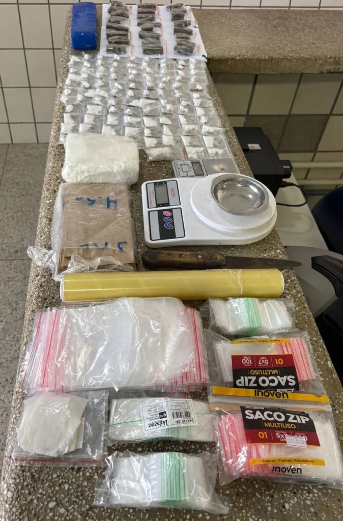 AS guarnições realizavam patrulhamento naquele município, quando, na Avenida Getúlio Vargas, perceberam um indivíduo em atitude suspeita. Na abordagem, foram encontradas com ele porções de entorpecentes. Após uma varredura no perímetro da ação, foram encontradas 810 g de maconha, 640 porções de cocaína, duas balanças, embalagens para acondicionamento de drogas e um aparelho de celular.