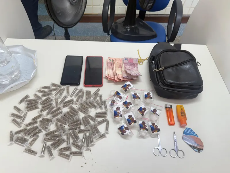 Durante a abordagem, uma mulher que se encontrava com o indivíduo tentou se desfazer de uma pochete. Após averiguação, foram encontradas 98 porções de maconha, 13 porções de cocaína, dois celulares e dinheiro em espécie.