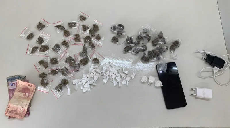 Com o indivíduo, foram encontradas 43 porções de cocaína, 58 porções de maconha, um aparelho celular, dois carregadores e dinheiro em espécie.