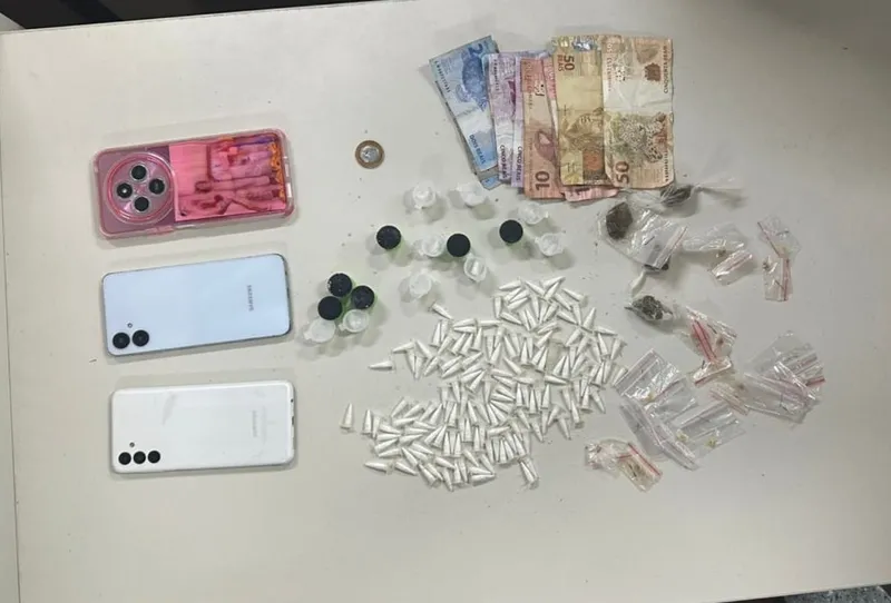 Na ação, foram apreendidas 152 porções de cocaína, 19 porções de crack, quatro porções de maconha, 19 porções de crack, três aparelhos de celular e dinheiro em espécie.
