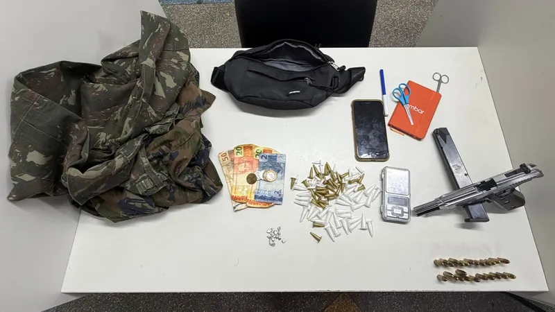 Na ação, foram apreendidos uma pistola calibre 9mm com numeração suprimida, um carregador alongado, 25 munições, além de entorpecentes, incluindo pedras de crack e pinos de cocaína, dinheiro em espécie, balança de precisão e outros materiais utilizados no tráfico.