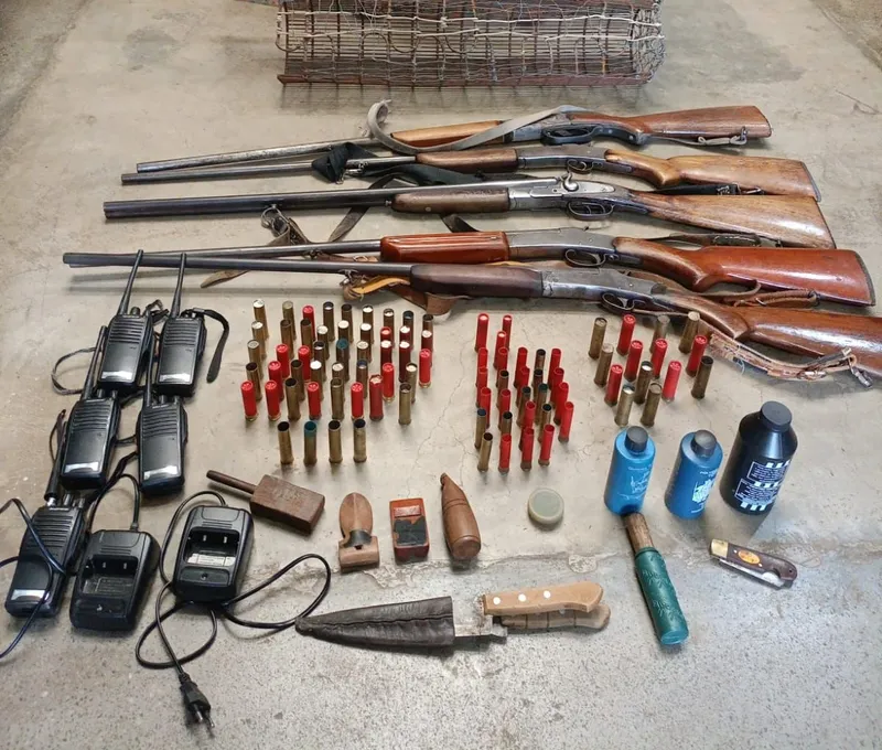 Na ação, foram apreendidas duas espingardas cal. .28, uma espingarda cano duplo cal. .32, duas espingardas cal. .32, 44 cartuchos cal. 32, 14 cartuchos cal. 28, dois cartuchos cal. 36, três apitos chamariz, cinco rádios comunicadores, duas bases carregadoras, dois frascos de pólvora, um frasco de espoletas, um secador de cartucho, um extrator de espoleta, uma tatuzeira de captura, duas facas e um canivete.