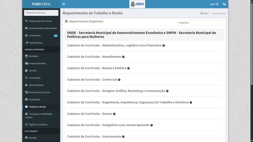 Para cadastrar o currículo na plataforma, o usuário deve acessar o site do Tudo Fácil, pelo dispositivo, fazer o login e visitar a aba “Trabalho e Renda”, na qual há opções de cadastramento em áreas como administração, atendimento, beleza e estética, design gráfico, marketing e comunicação, engenharia, segurança do trabalho, entre outras.