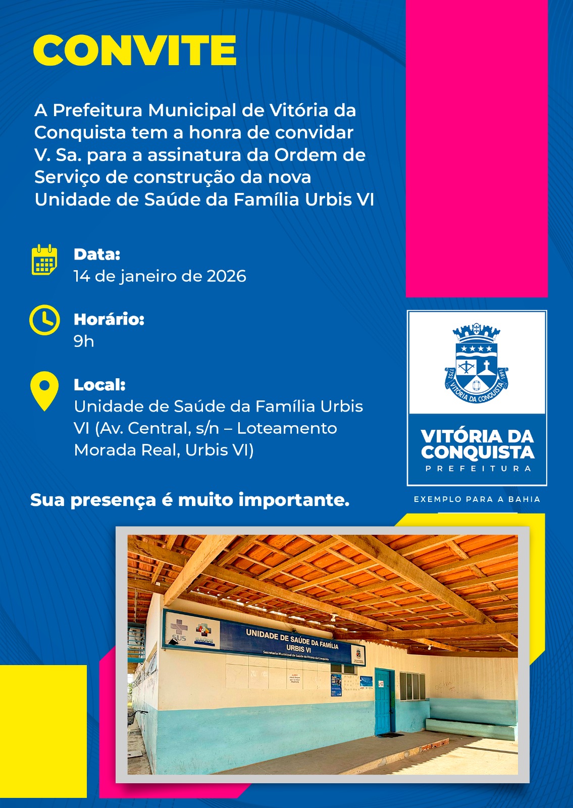 Nesta quarta-feira (14), às 9h, a Prefeitura de Vitória da Conquista, por meio da Secretaria Municipal de Saúde, realiza ato de assinatura da Ordem de Serviço para construção da nova Unidade de Saúde Urbis VI.