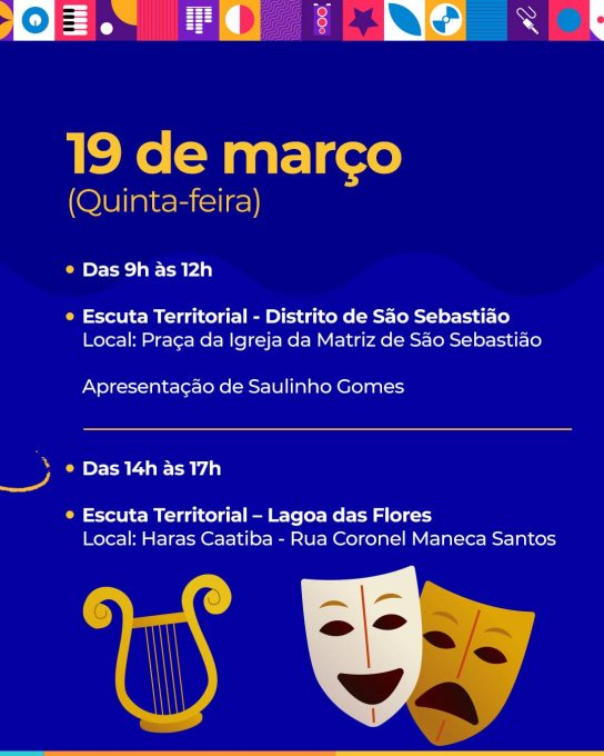 O Governo Municipal informa que as Escutas Territoriais para elaboração do Plano Municipal de Cultura já estão com datas definidas. A nova programação acontecerá nos dias 18, 19 e 20 de março. O adiamento ocorreu como medida de segurança, em virtude das fortes chuvas que atingiram o município desde a última semana.