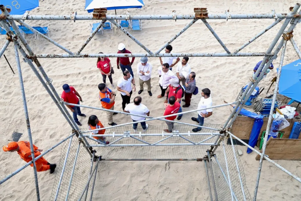Megaoperação – Para a montagem da estrutura, é necessária a utilização de um grande grupo de especialistas e trabalhadores, além de equipamentos como caminhões Munck, escavadeiras, equipamentos de içamento, transporte vertical e equipes de topografia, responsáveis pela correta locação dos pontos de fundação, tendo em vista a necessidade de precisão geométrica em ambiente de solo não consolidado, como é a faixa de areia.