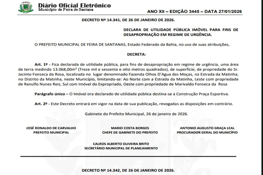 A Prefeitura de Feira de Santana vai construir uma ampla e moderna Praça Esportiva no distrito da Matinha. O Decreto Nº 14.341, declarando de utilidade pública o imóvel para fins de desapropriação em regime de urgência, foi assinado pelo prefeito José Ronaldo e publicado no Diário Oficial Eletrônico do Município de Feira de Santana (www.feiradesantana.ba.gov.br), edição desta terça-feira (27).