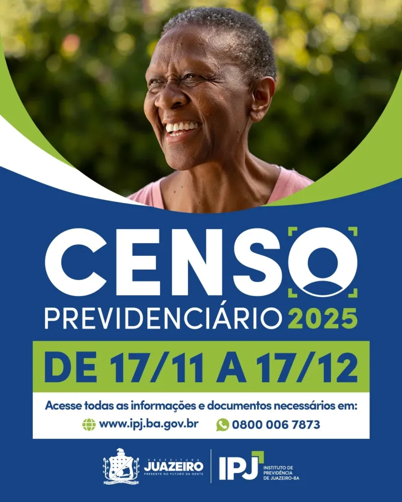 O Instituto de Previdência de Juazeiro/IPJ, iniciará no dia 17 de novembro o Censo Cadastral Previdenciário dos servidores públicos municipais vinculados ao Regime Próprio de Previdência Social/RPPS. A ação, que segue até o dia 17 de dezembro de 2025, é obrigatória para servidores ativos, aposentados, pensionistas e dependentes.