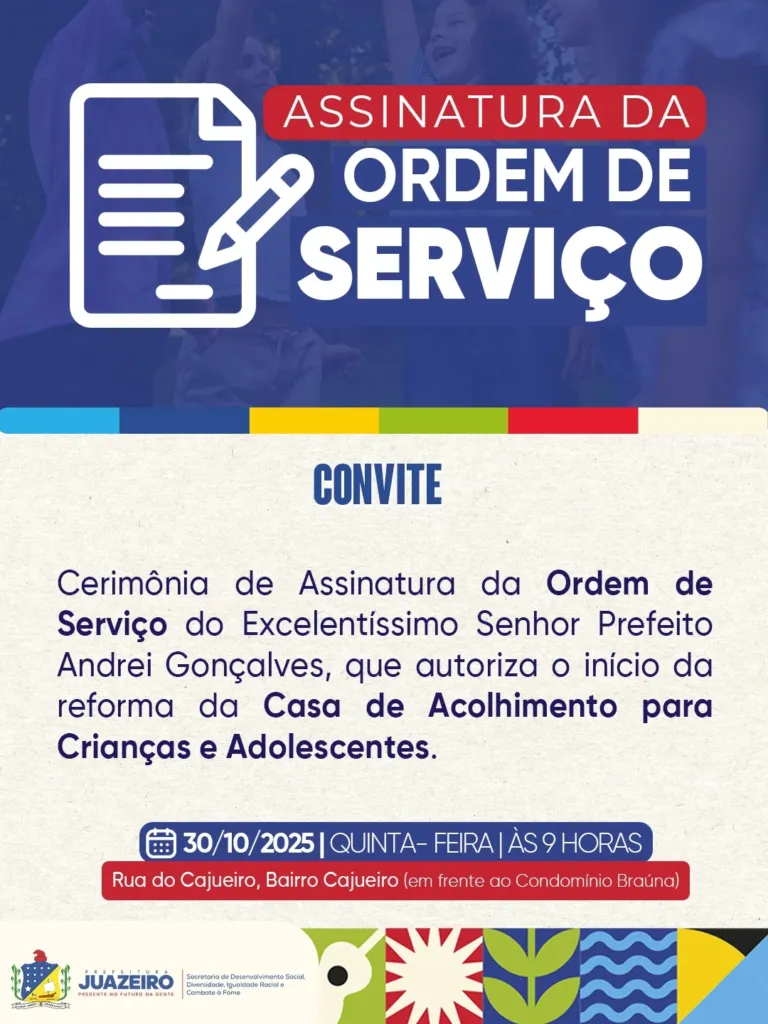 A Prefeitura de Juazeiro, por meio da Secretaria de Desenvolvimento Social, Diversidade, Igualdade Racial e Combate à Fome/Sedes, realiza nesta quinta-feira (30), às 9h, a cerimônia de assinatura da Ordem de Serviço que autoriza o início das obras de reforma da Casa de Acolhimento para Crianças e Adolescentes.