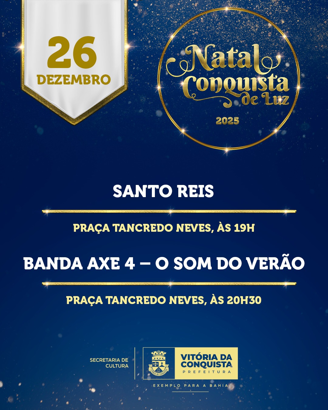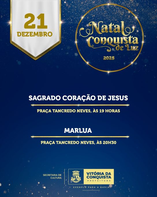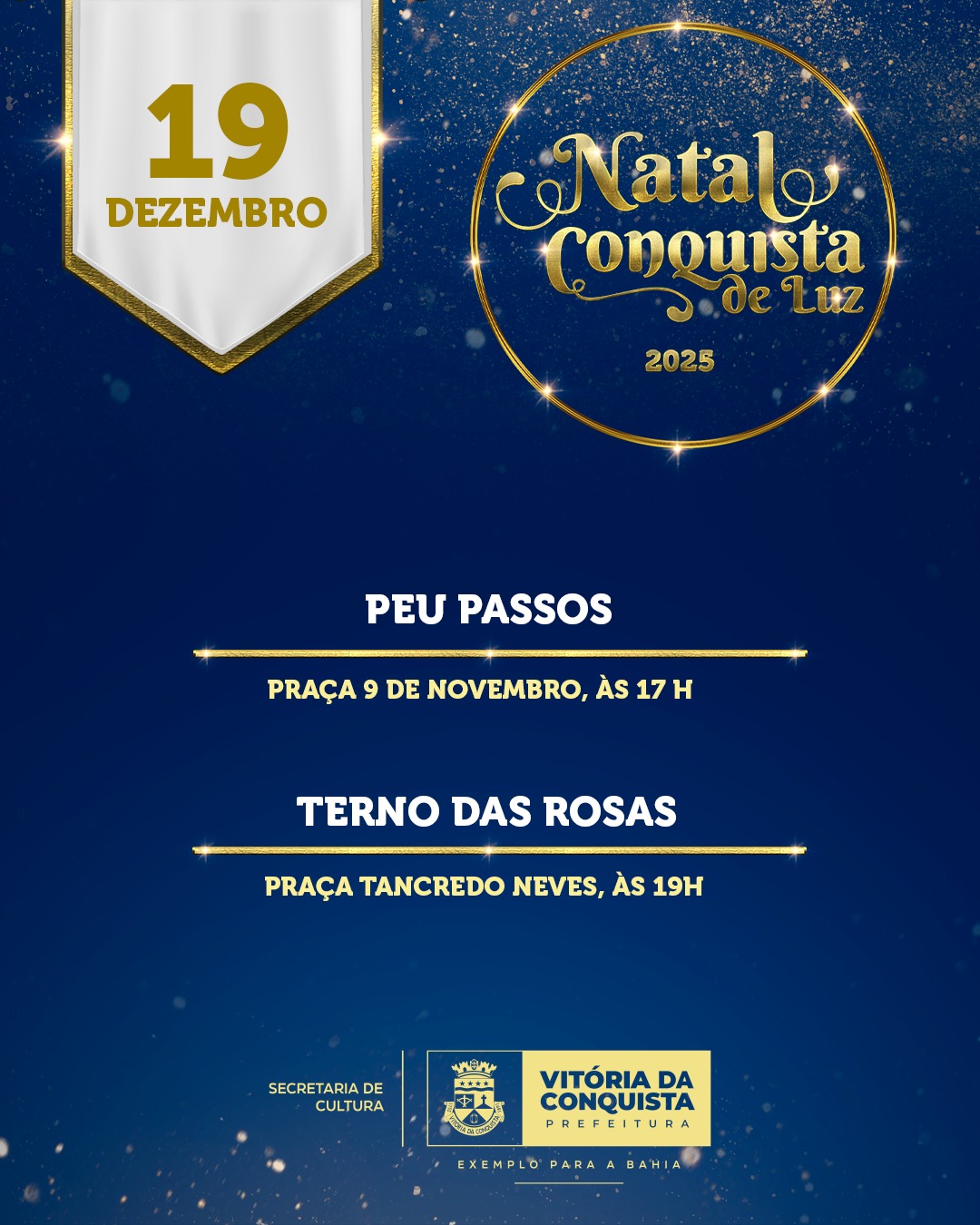Começa neste sábado (13), a apresentação das atrações musicais e dos Ternos de Reis do Natal Conquista de Luz. As atrações, juntamente com a tradicional iluminação e decoração natalina, levam muita alegria e música à Praça Tancredo Neves, tornando o clima natalino ainda mais festivo.
