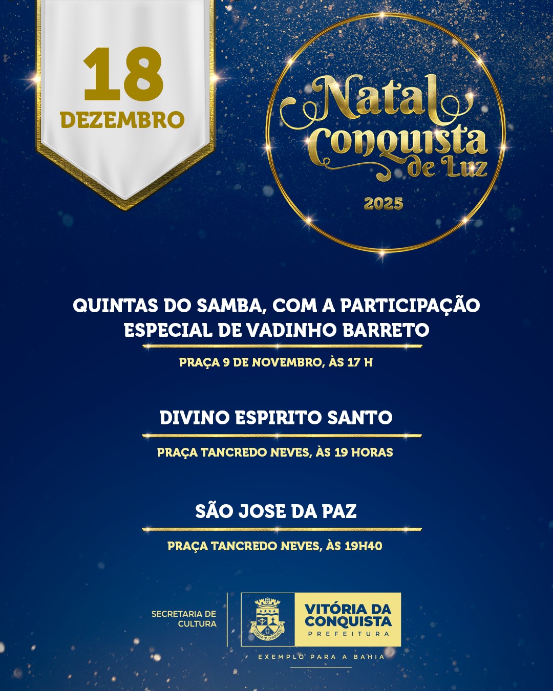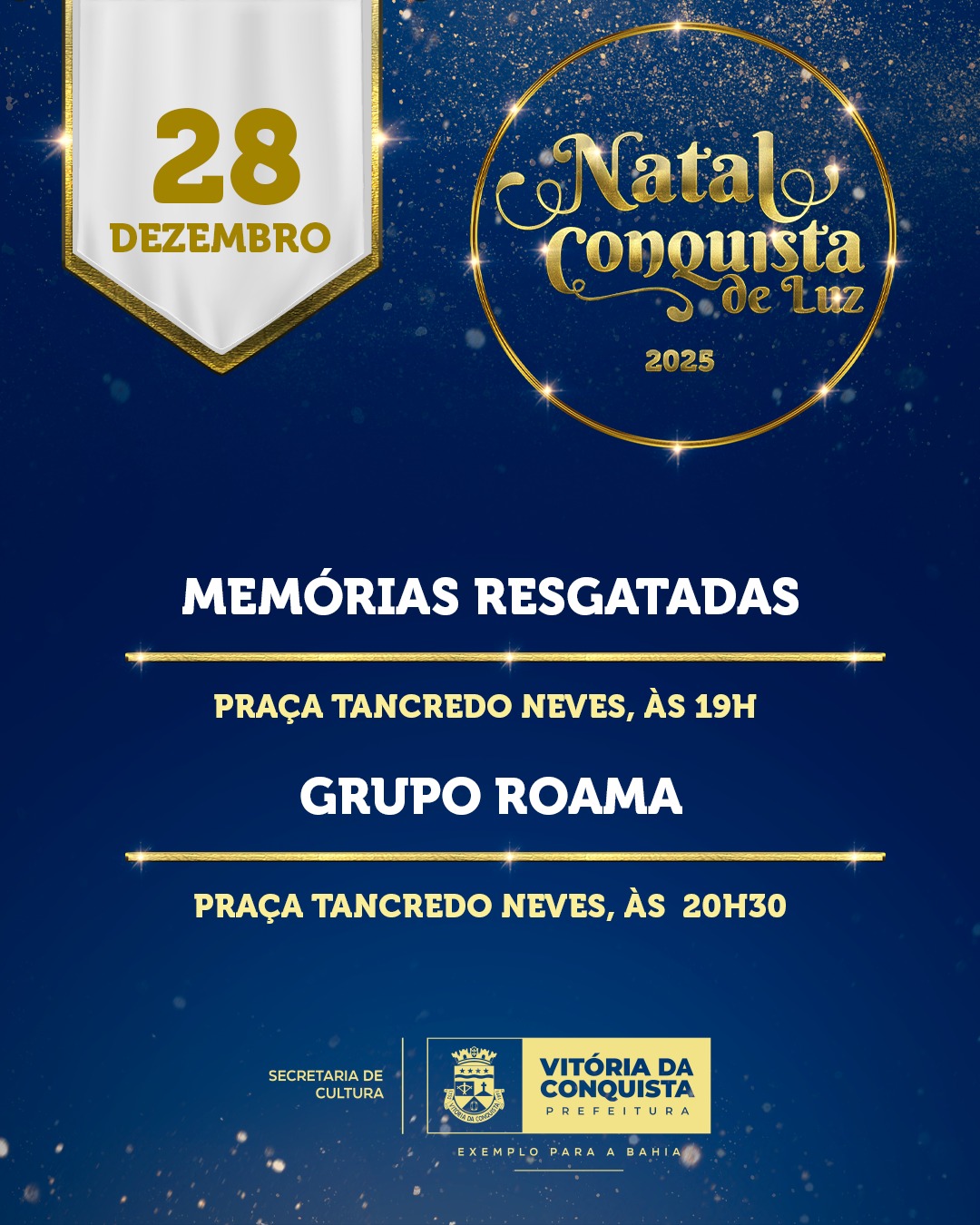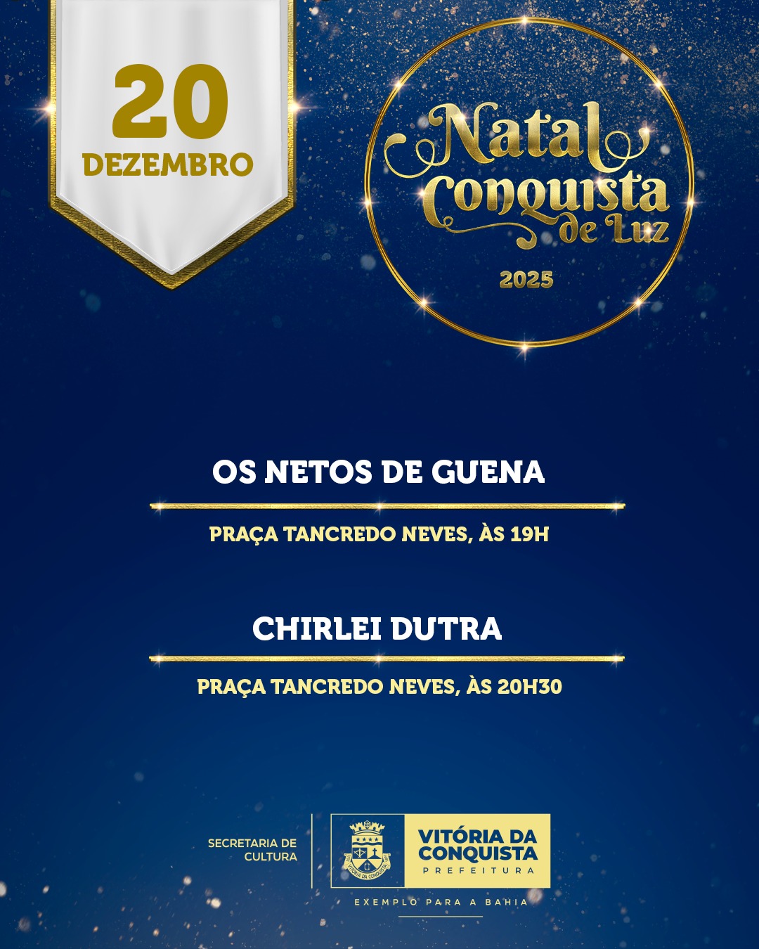 Começa neste sábado (13), a apresentação das atrações musicais e dos Ternos de Reis do Natal Conquista de Luz. As atrações, juntamente com a tradicional iluminação e decoração natalina, levam muita alegria e música à Praça Tancredo Neves, tornando o clima natalino ainda mais festivo.