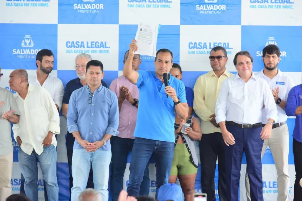 A Prefeitura de Salvador entregou nesta quinta-feira (29) mais 4.978 títulos de propriedade, pelo programa de regularização fundiária Casa Legal, na localidade do Bate Coração, em Paripe. Participaram da solenidade o prefeito Bruno Reis, o secretário municipal de Infraestrutura, Luiz Carlos de Souza, e o desembargador Roberto Maynard Frank, do Tribunal de Justiça da Bahia (TJ-BA), entre outras autoridades.