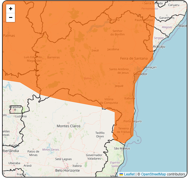 Nesta quarta-feira, o Instituto Nacional de Meteorologia (Inmet) atualizou o alerta laranja para chuvas até sexta-feira (6). O aviso indica o perigo de chuvas intensas, variando entre 30 e 60 mm/h ou 50 e 100 mm/dia e ventos intensos (60-100 km/h). Há também o risco de corte de energia elétrica, queda de árvores, alagamentos e descargas elétricas. Em caso de emergência, a Defesa Civil pode ser acionada pelo número (77) 3229-3456, ou através do WhatsApp (77) 98856-5070.
