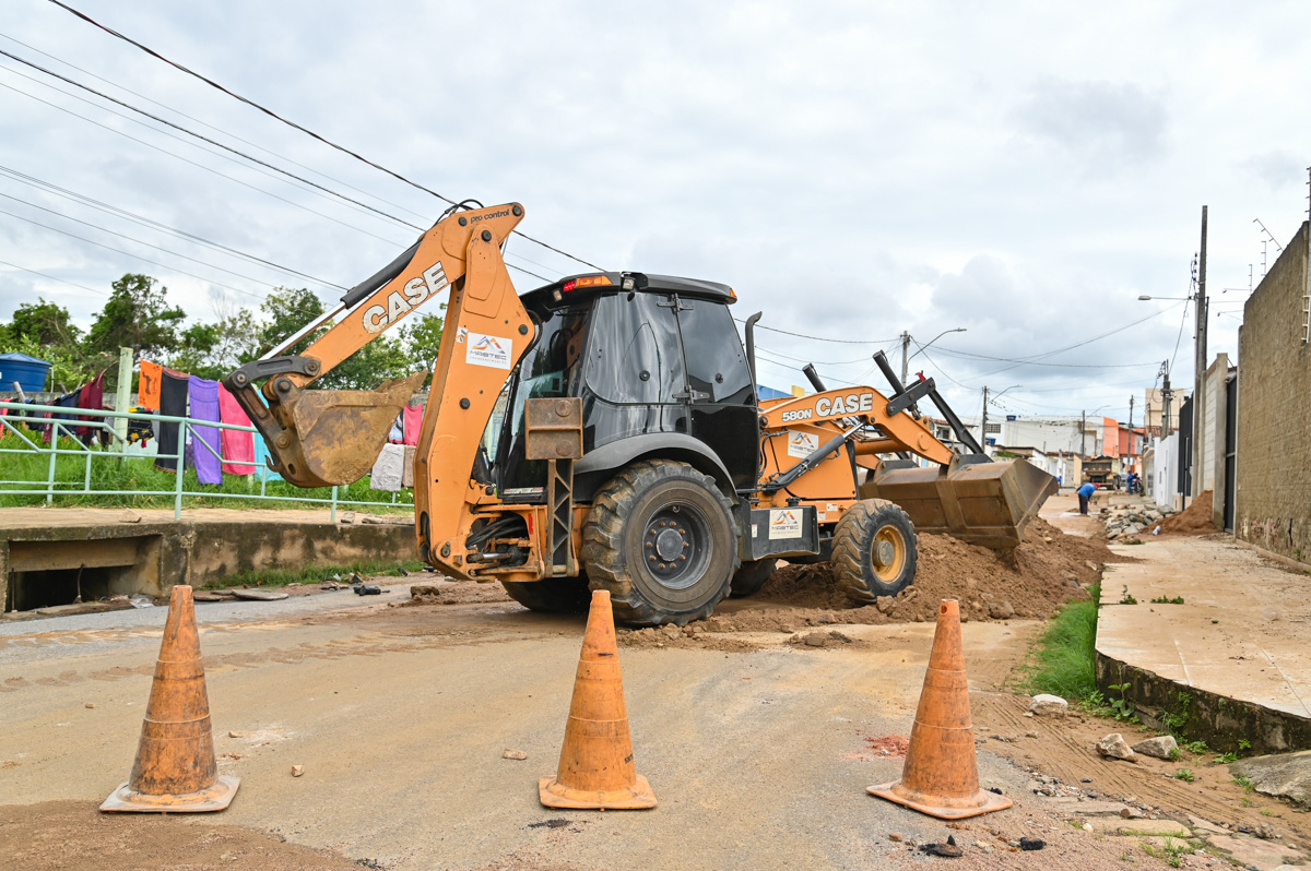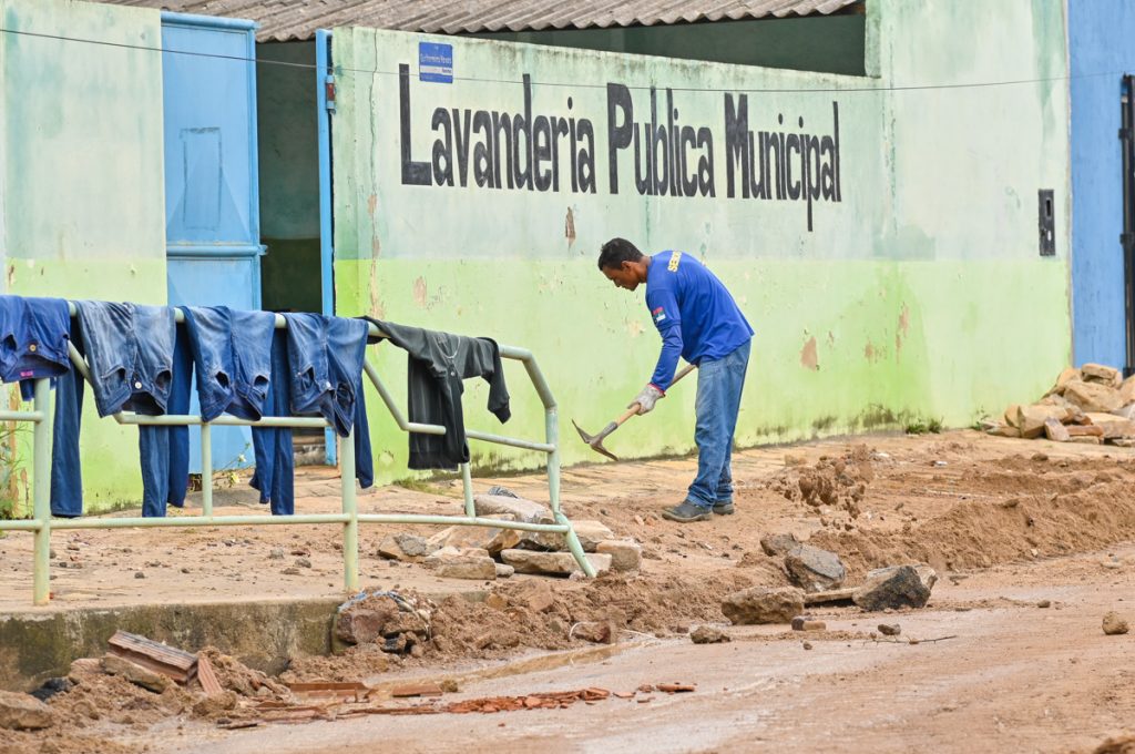 Equipes da Secretaria Municipal de Infraestrutura Urbana estiveram na Rua Guilhermino Novais realizando a retirada de sedimentos e outros materiais, já que a força da enxurrada chegou a arrancar o calçamento das vias.