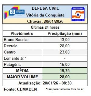 Vitória da Conquista registrou uma média de 19,75 milímetros de chuva na noite de segunda-feira (19). Mas, embora tenha havido problema na Rua Lourival, por conta de uma intervenção realizada pela Embasa, na rede de esgoto, não houve outros danos significativos, graças às obras estruturantes realizadas pelo Governo Municipal nos últimos anos.