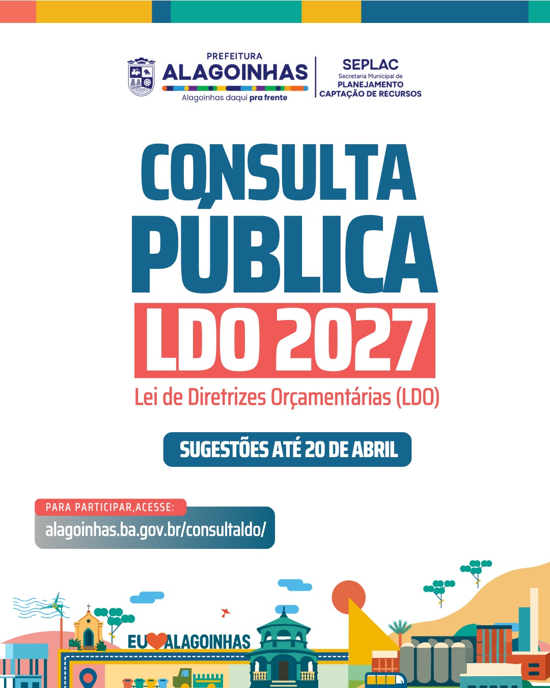 A Prefeitura Municipal de Alagoinhas abriu a consulta pública on-line que vai orientar as diretrizes orçamentárias do governo em 2027. Até o dia 20 de abril, os cidadãos poderão contribuir com sugestões, opiniões e elencando prioridades para o próximo ano. Os cidadãos podem participar preenchendo formulário eletrônico no site: alagoinhas.ba.gov.br/consultaldo.