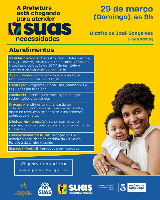 Neste domingo (29), a Prefeitura de Vitória da Conquista realiza a primeira edição de 2026 do programa Suas na Comunidade. A ação acontece no distrito de José Gonçalves, das 9h às 13h, em frente à praça central, ao lado da Subprefeitura.