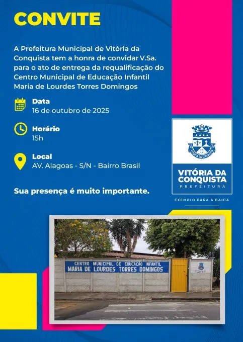 A Prefeitura de Vitória da Conquista realiza, na tarde desta quinta-feira (16), a entrega do Centro Municipal de Educação Infantil (Cmei) Maria de Lourdes Torres Domingos. Localizada na Avenida Alagoas, no bairro Brasil, essa é a 96ª unidade revitalizada pelo Governo Municipal, nos últimos anos.