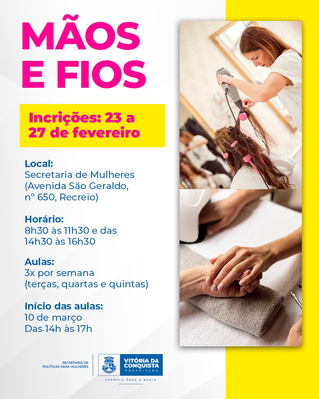 De 23 e 27 de fevereiro, das 8h30 às 11h30 e das 14h30 às 16h30, a Secretaria Municipal de Políticas para Mulheres (SMPM) abrirá inscrições para o curso de Manicure e Escovista. A formação, que conta com 20 vagas, é destinada a mulheres a partir dos 16 anos de idade e que possuam Ensino Fundamental completo.