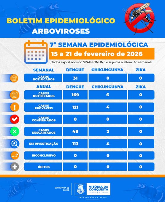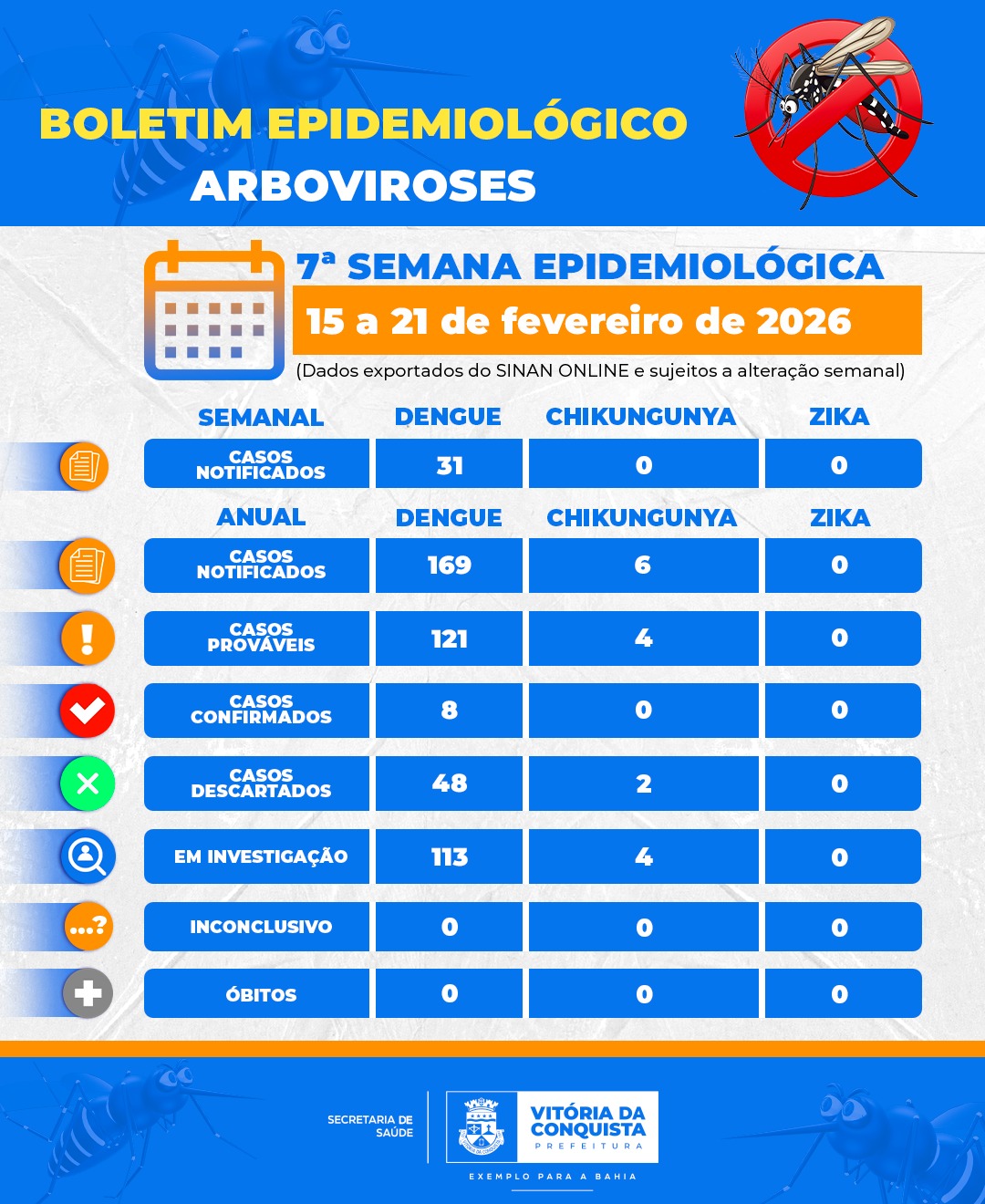 A Coordenação de Vigilância Epidemiológica divulgou o Boletim das Arboviroses da 7ª Semana Epidemiológica (SE), com 31 notificações suspeitas de dengue e nenhuma de chikungunya e zika. Não há registro de pessoas hospitalizadas por arboviroses.