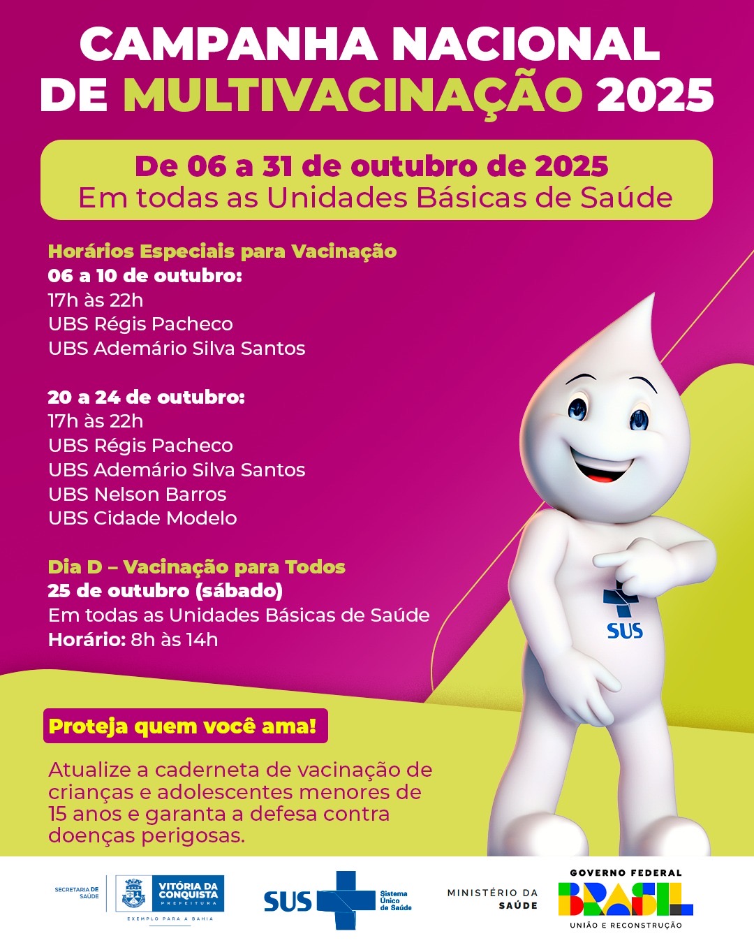 Com o objetivo de atualizar a caderneta de vacinação de crianças e adolescentes menores de 15 anos e reforçar a proteção contra doenças imunopreveníveis, a Secretaria Municipal de Saúde (SMS) inicia, a partir desta segunda-feira (6), a Campanha Nacional de Multivacinação, seguindo as orientações do Ministério da Saúde.