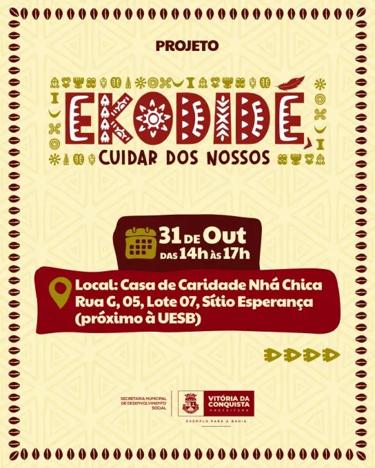 A Prefeitura de Vitória da Conquista, por meio da Secretaria Municipal de Desenvolvimento Social (Semdes), realiza nesta sexta-feira (31), a segunda edição do projeto Ekodidé: Cuidar dos Nossos, que tem como objetivo promover atividades comunitárias em terreiros de religiões de matriz africana. A ação acontece das 14h às 17h, na Casa de Caridade Nhá Chica, localizada na Rua G, nº 5, Lote 7, Sítio Esperança (próximo à Uesb).