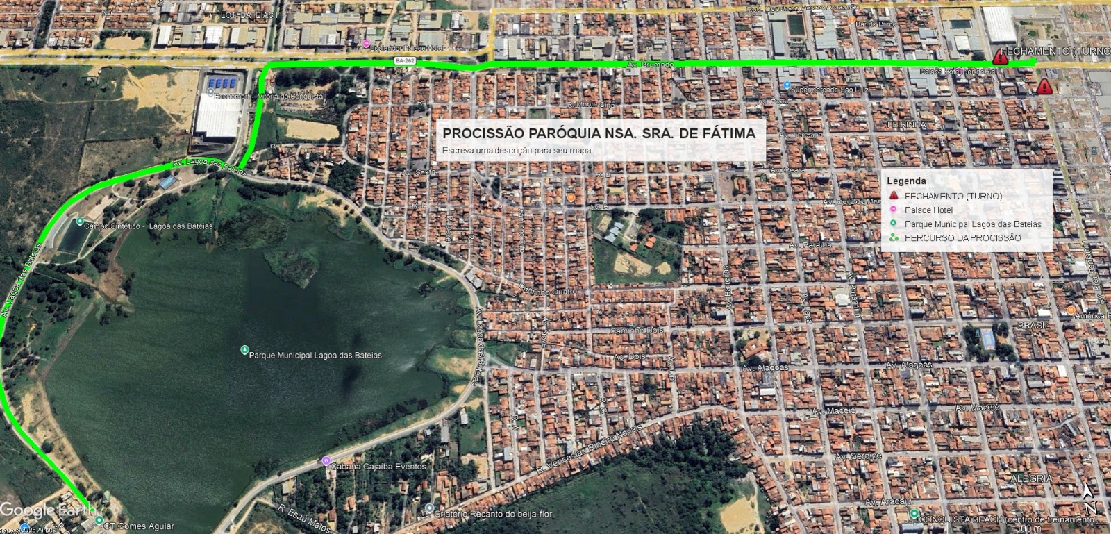 De acordo com a Secretaria de Mobilidade Urbana (Semob), serão interditadas as vias que dão acesso ao Parque Municipal Lagoa das Bateias até a saída da procissão, que seguirá pela Avenida Brumado, a qual estará fechada em toda sua extensão, até a chegada na Paróquia Nossa Senhora de Fátima. A Semob reforça, ainda, que acompanhará todo o trajeto da procissão e manterá interditado o trânsito da Avenida Brumado entre a Av. Boa Vontade e a Av. Frei Benjamin para a Missa Campal até as 11hs.