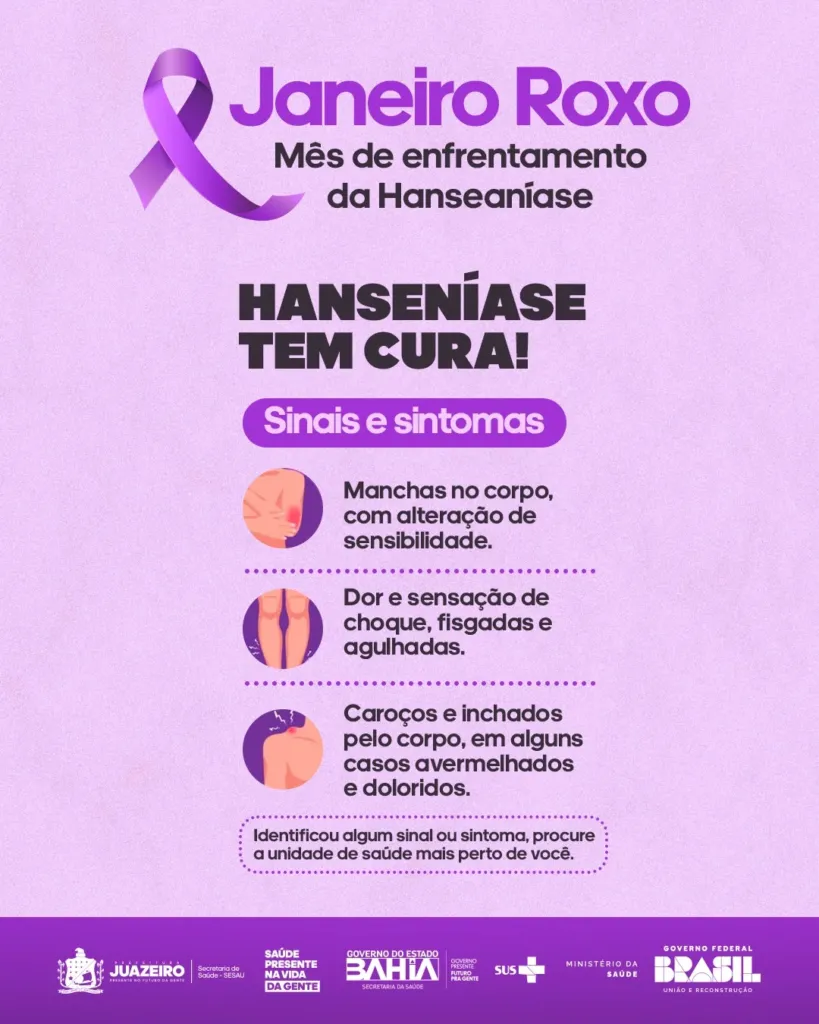 A Secretaria Municipal de Saúde de Juazeiro (Sesau) reforça, durante o mês de janeiro, a importância da campanha Janeiro Roxo, dedicada à conscientização, prevenção, diagnóstico precoce e tratamento da hanseníase. A doença, que ainda registra casos no Brasil, tem cura e o tratamento é gratuito, ofertado pelo Sistema Único de Saúde (SUS).