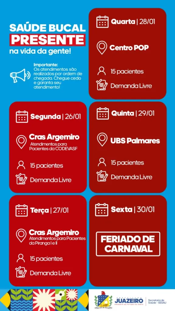 A Unidade de Atendimento Odontológico Móvel (UOM) segue levando serviços para a população. A iniciativa realizada pela Prefeitura de Juazeiro, por meio da Secretaria Municipal de Saúde (Sesau), está oferecendo, entre os dias 26 e 29 de janeiro, 15 atendimentos diários a partir das 8h. É necessário que os pacientes apresentem RG, CPF e Cartão SUS.