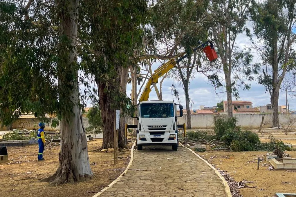 Nesta terça-feira (14), as equipes de limpeza e poda estão concentradas nos cemitérios do Kadija, Saudade e Campo da Paz, que passam por amplos serviços de roçagem, capina, poda de árvores e melhorias estruturais. Os trabalhos fazem parte dos preparativos para o Dia de Finados, quando os espaços recebem milhares de visitantes.