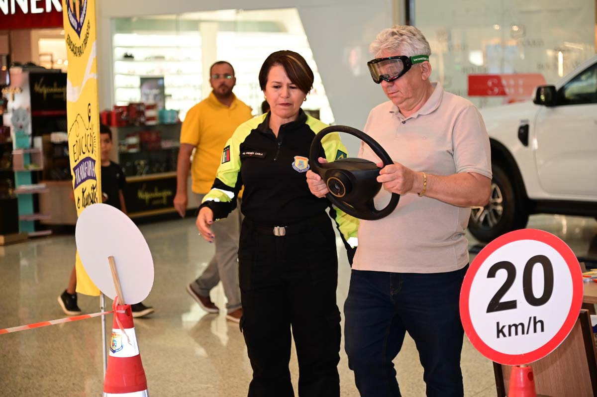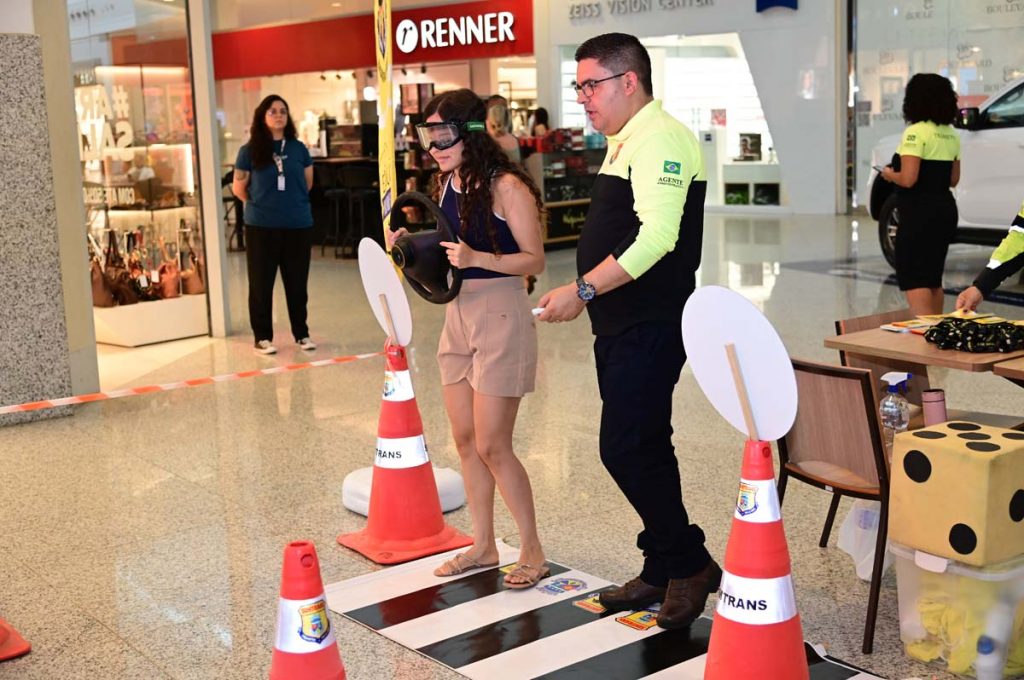 Durante a ação, o público é convidado a participar de uma experiência prática que simula a condução de um veículo sob efeito do álcool. A agente de trânsito Andréa Carla explica que a proposta é proporcionar uma vivência educativa, reforçando a importância do respeito às leis de trânsito. “Esse evento nós trazemos aqui para dentro do shopping e contextualizamos que é uma via. A gente coloca os óculos no cidadão, com lentes especiais, simulando a alcoolemia no volante. A pessoa faz o trajeto, para no semáforo, observa a sinalização e consegue vivenciar o momento de alcoolemia e direção”, explicou.