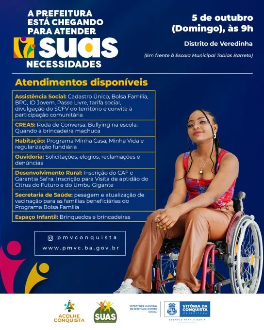 Neste domingo (5), a Prefeitura de Vitória da Conquista realiza a 19ª edição do programa Suas na Comunidade 2025, no distrito de Veredinha. A ação será realizada a partir das 9h, em frente à Escola Municipal Tobias Barreto.