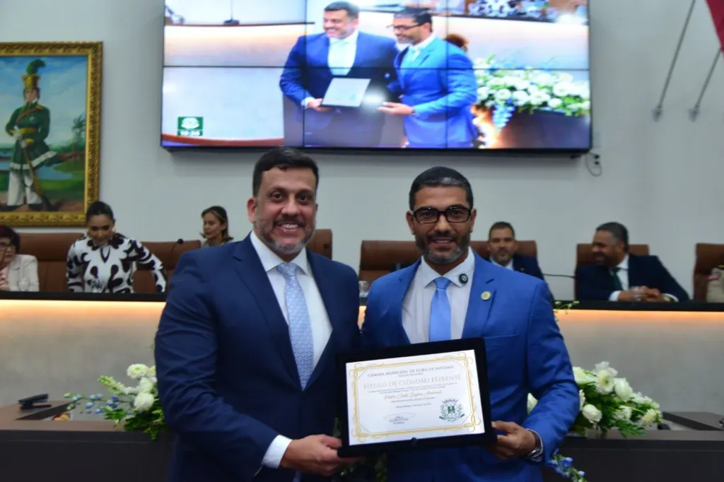 “Já me considero cidadão feirense, de fato, há muitos anos, pois resido aqui desde 2015 – quando assumi a Promotoria em Alagoinhas. Porém, meu vínculo com Feira de Santana existe desde quando eu era adolescente, época em que eu frequentava a cidade por lazer”. Este é um trecho do discurso realizado do promotor de Justiça Pedro Costa Safira Andrade, homenageado durante Sessão Solene realizada na noite desta quinta-feira (19), na Câmara Municipal. A honraria foi proposta pelo vereador Josivaldo Menezes (União Brasil).