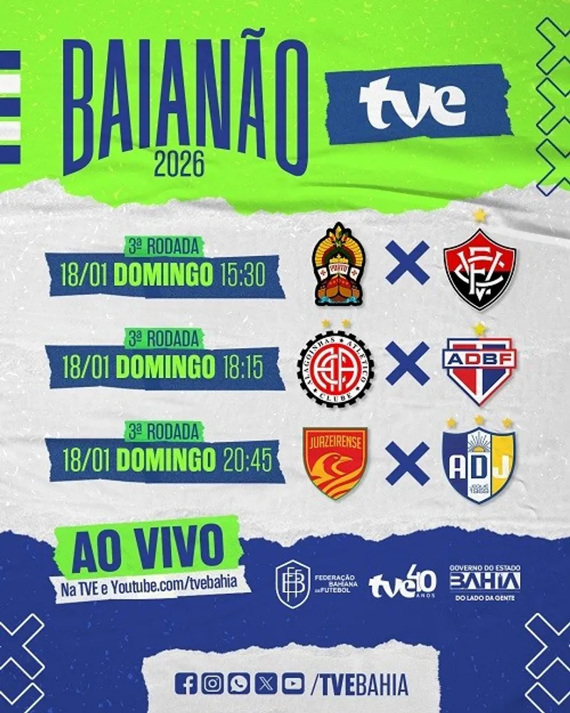 Neste domingo (18), a TVE exibe três partidas da terceira rodada do Campeonato Baiano de Futebol 2026. A transmissão começa às 15h45, com Porto e Vitória, no Estádio Agnaldo Bento, em Porto Seguro. Na sequência, entram em campo Atlético e Bahia de Feira, às 18h15, na Arena Antônio Carneiro, em Alagoinhas. E no último jogo, às 20h45, Juazeirense e Jequié jogam no estádio Adauto Moraes, em Juazeiro. Os torcedores podem acompanhar todos os jogos ao vivo pela TVE e também pelo youtube.com/tvebahia.