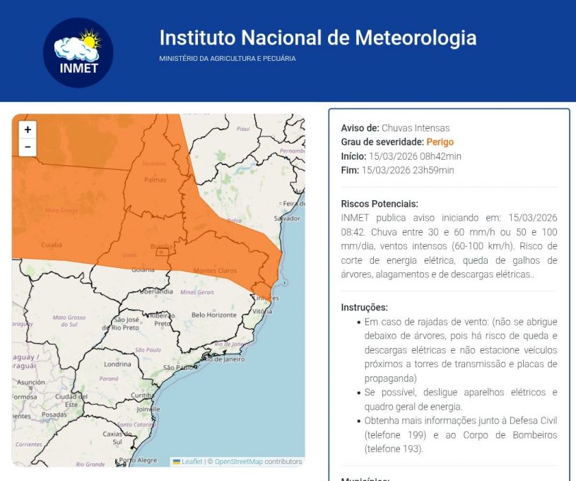 Segundo o Inmet, a previsão é que ocorram chuvas entre 30 e 60 mm/h e ventos intensos entre 60 e 100km/h. Há também risco potencial de corte de energia elétrica, queda de árvores, alagamentos e descargas elétricas para todo o município.